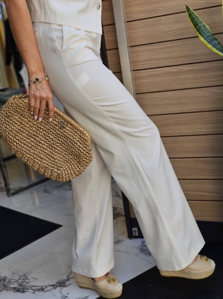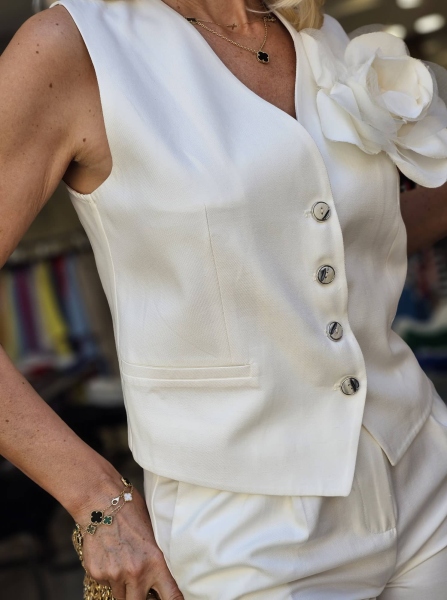 Комплект елек и панталон в бял цвят. Елекът е с втален силует и има аксесоар брошка към него. Панталонът е с широки крачоли и басти.