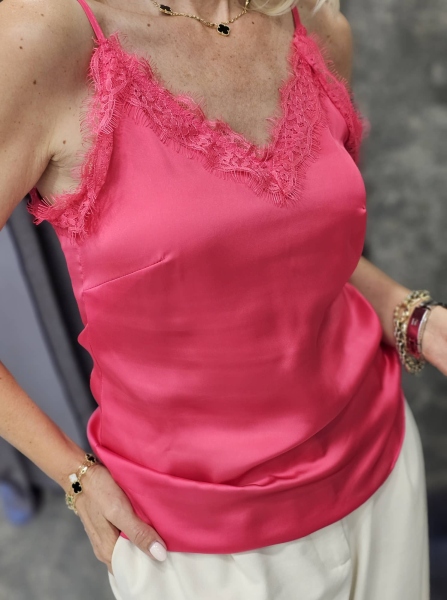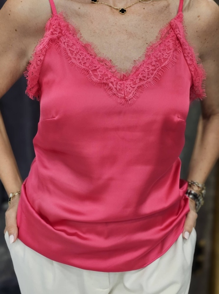Топ в цикламен цвят от тънка материя. Моделът е със свободен силует и е декориран в горната си част с дантела.