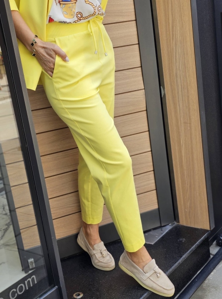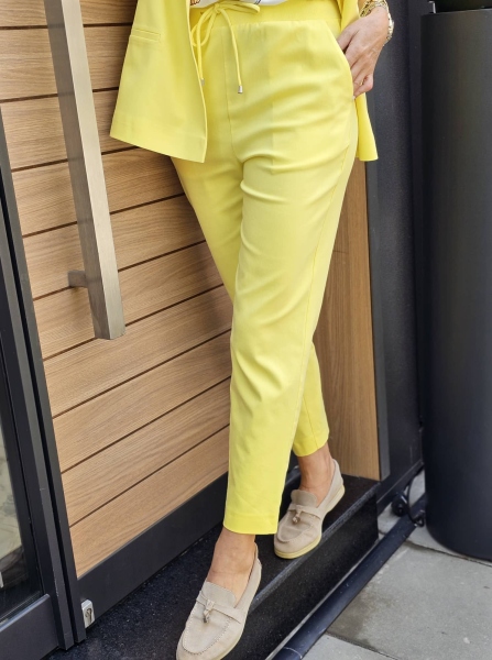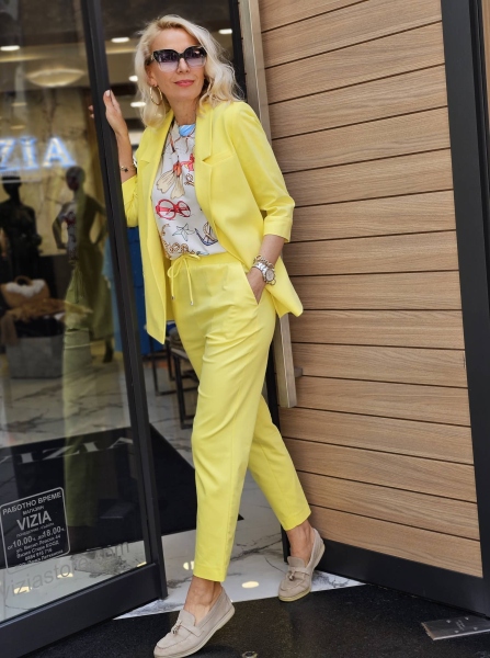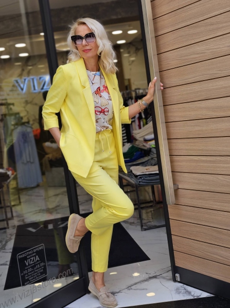 Спортно- елегантен комплект сако и панталон в жълт цвят. Сакото е със свободна кройка без закопчаване. Панталонът е със стесняващи се крачоли и ластик на талията.