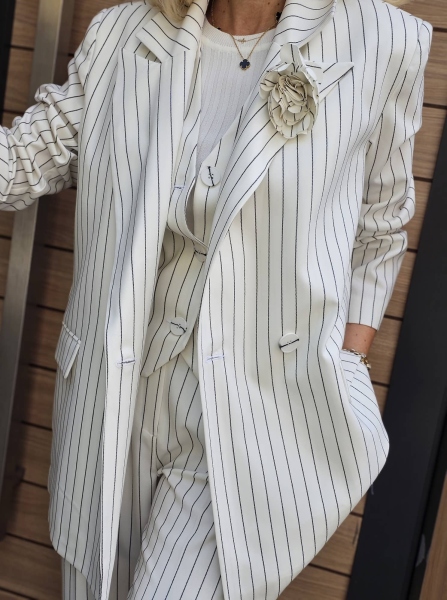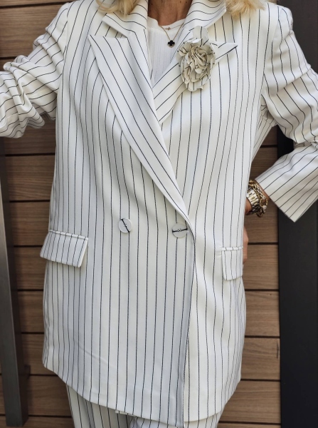 Сако в бял цвят с раиран десен и аксесоар брошка цвете. Моделът е с много свободен силует и се закопчава с копчета.