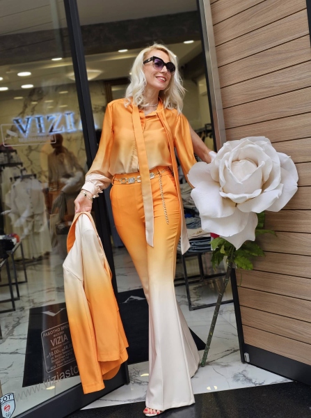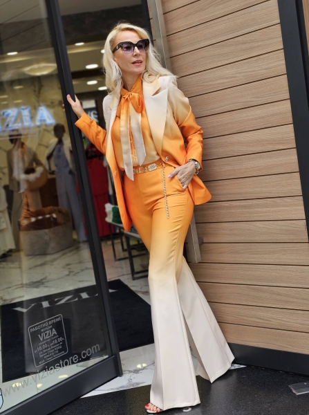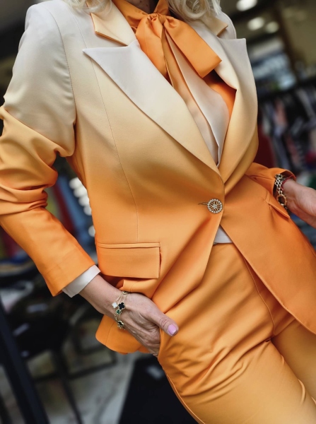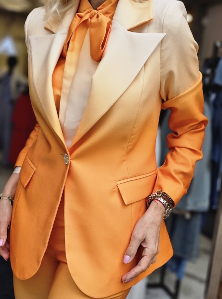 Комплект сако и панталон в преливащ оранжев цвят. Сакото е с втален силует и се закопчава с едно копче. Панталонът е чарлстон с висока талия и се закопчава със страничен цип.