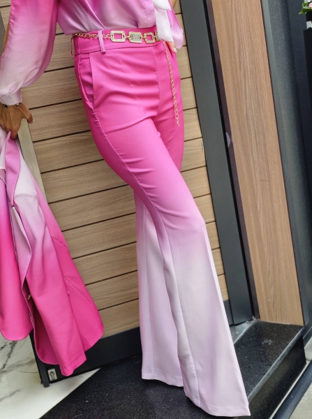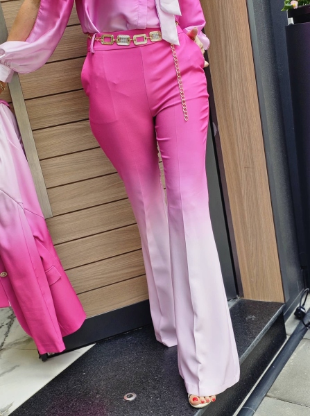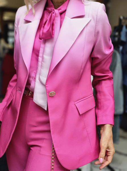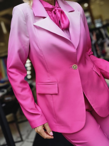 Комплект сако и панталон в преливащ цикламен цвят. Сакото е с втален силует и се закопчава с едно копче. Панталонът е чарлстон с висока талия и се закопчава със страничен цип.