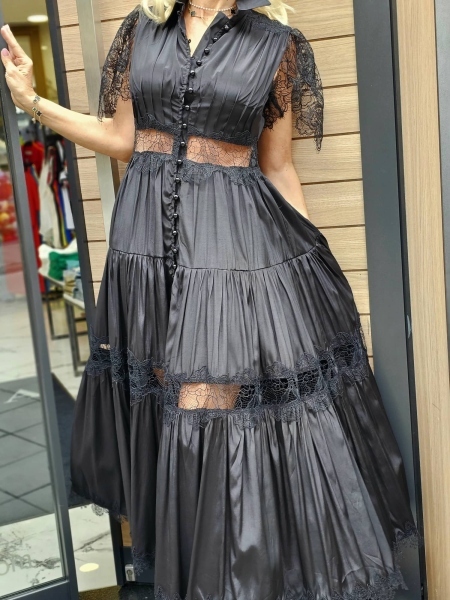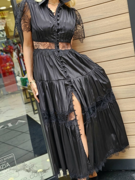 Дълга рокля в черно от сатенирана материя и дантела. Моделът е с вталена горна част и падаща свободно долна част. Закопчава се с копчета.