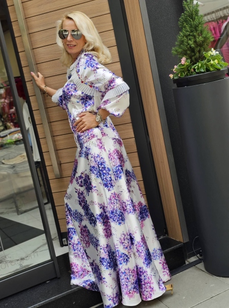Дълга рокля от сатенирана материя с флорален десен и ефектни ръкави. Моделът е с втален силует и се закопчава само с копчета.