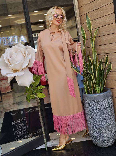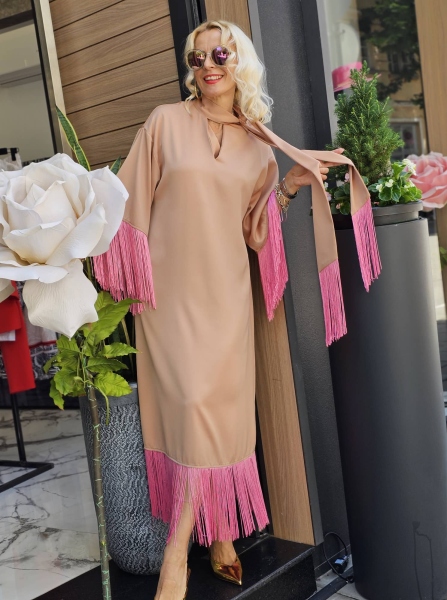 Дълга рокля в цвят нюд с декорация от ресни. Моделът е с напълно свободен силует и се облича без закопчаване.