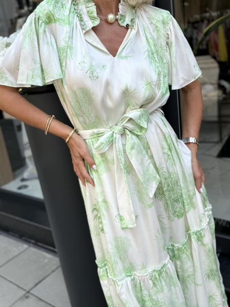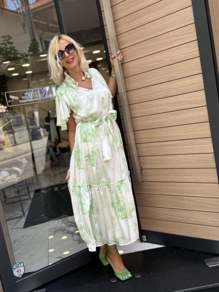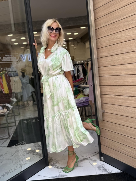Рокля от фина сатенирана материя с къс ръкав. Моделът е със свободен силует. Към нея има текстилен колан за вталяване.