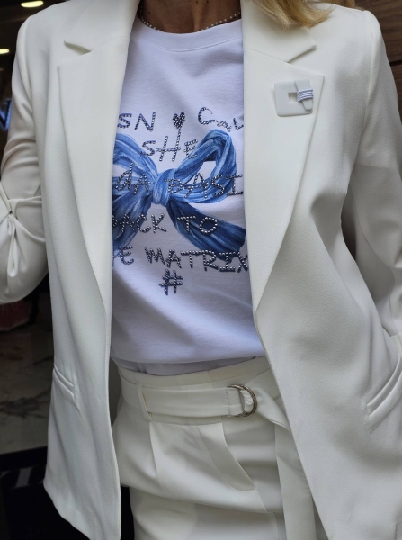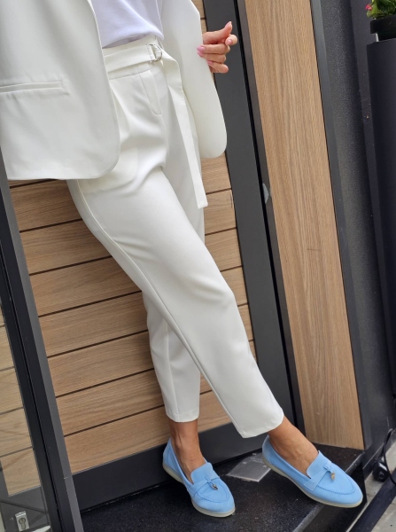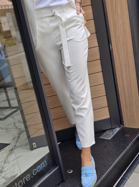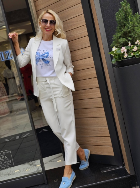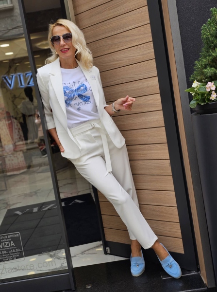 Комплект сако с панталон в бял цвят. Сакото е със свободен силует и е без закопчаване. Панталонът се стеснява по кракът и има ластик на талията.