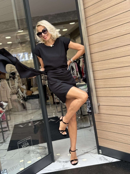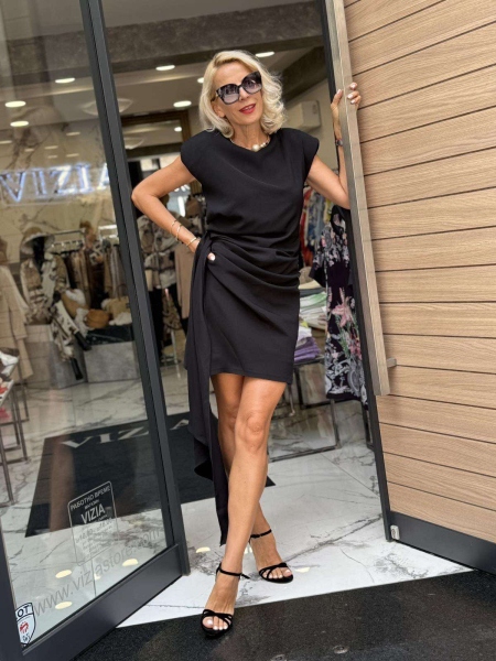 Рокля в черен цвят с изчистен дизайн с набор от едната страна и дълъг шлейф. Моделът се закопчава с цип.