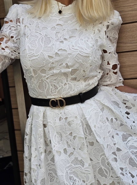 Дантелена рокля с вталена горна част и свободна долна част. Моделът има шев на талията и се закопчава с цип. Към нея има аксесоар колан.