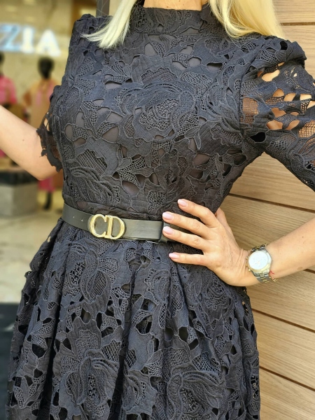 Дантелена рокля с вталена горна част и свободна долна част. Моделът има шев на талията и се закопчава с цип. Към нея има аксесоар колан.