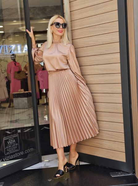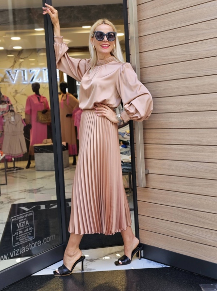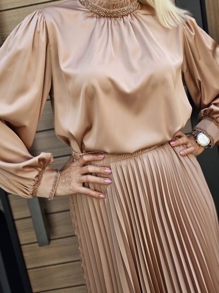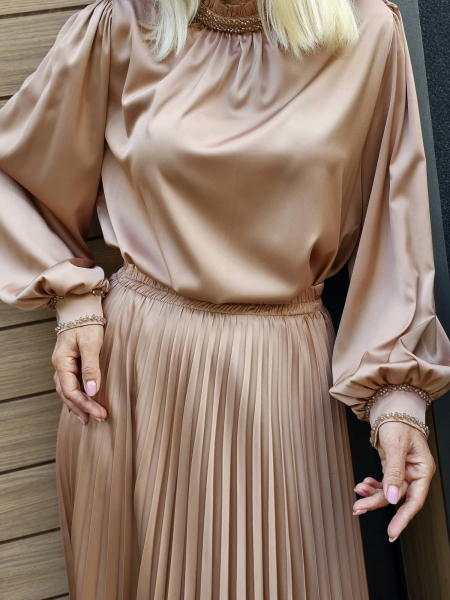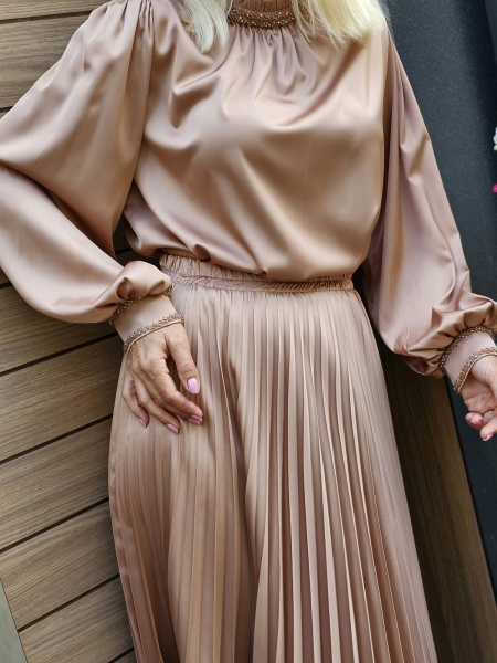 Комплект риза и пола от сатенирана материя. Ризата е със свободна кройка и има декорация по деколтето и маншетите. Полата е солей с ластик на талията.