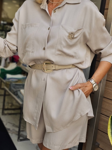 Комплект риза и къси панталонки от фина материя. Ризата е с издължена линия и свободен силует. Панталонките са с висока талия и се закопчават с цип. Към комплектът има и аксесоар колан.