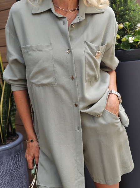 Комплект риза и къси панталонки от фина материя. Ризата е с издължена линия и свободен силует. Панталонките са с висока талия и се закопчават с цип. Към комплектът има и аксесоар колан.