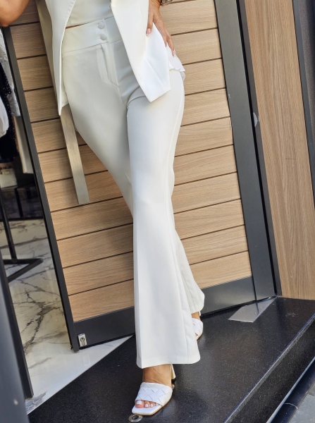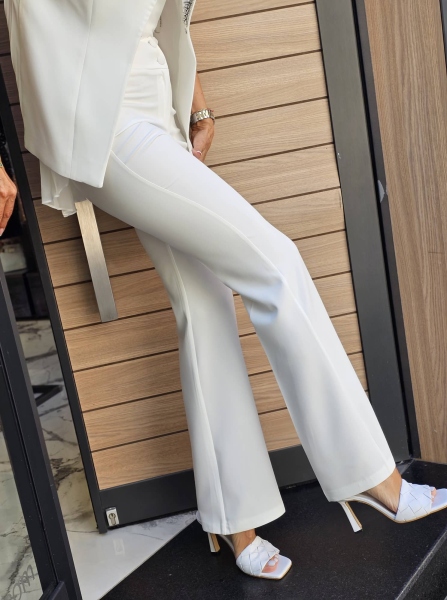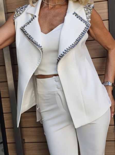 Комплект от три части в бяло. Елекът е без закопчаване с декорация от камъни и тюлен гръб. Бюстието е с вградени подплънки и се закопчава с цип. Панталонът е чарлстон с висока талия.