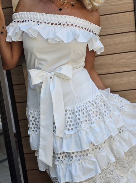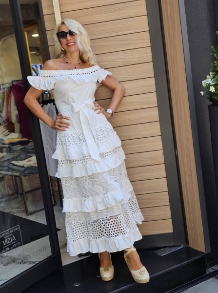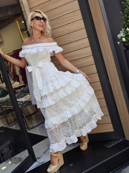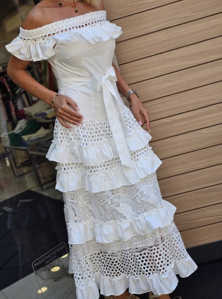 Дълкга рокля в бял цвят с голи рамене и декорация от дантела. Моделът е с втален силует и се закопчава с цип.