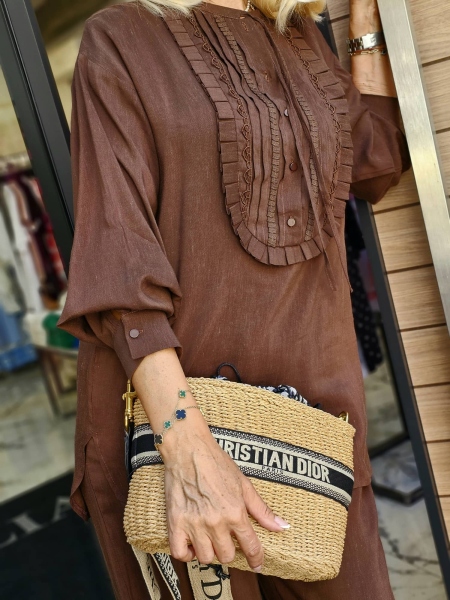 Комплект риза и панталон в наситен кафяв цвят. Ризата е със свободен силует и се закопчава в предната си част с копчета. Панталонът е с широки крачоли и се закопчава с цип и копче.
