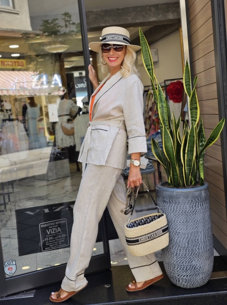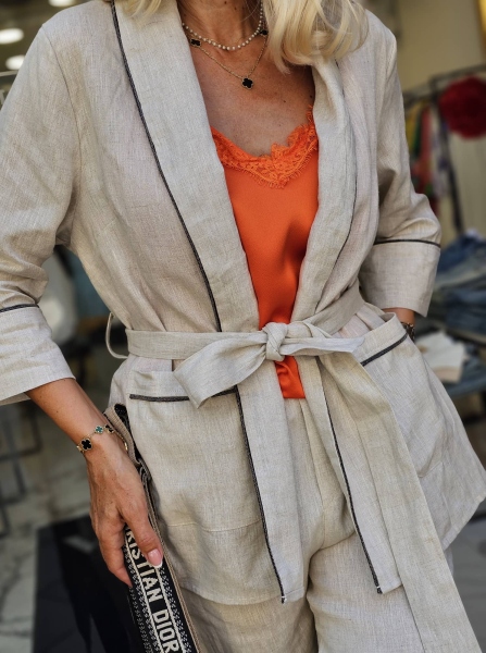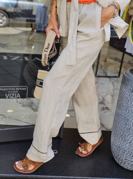 Комплект сако и панталон в бежов цвят от лен. Сакото е с права кройка без закопчаване. Има колан към него за вталяване. Панталонът е с ластичен колан и прави крачоли.
