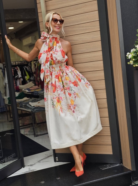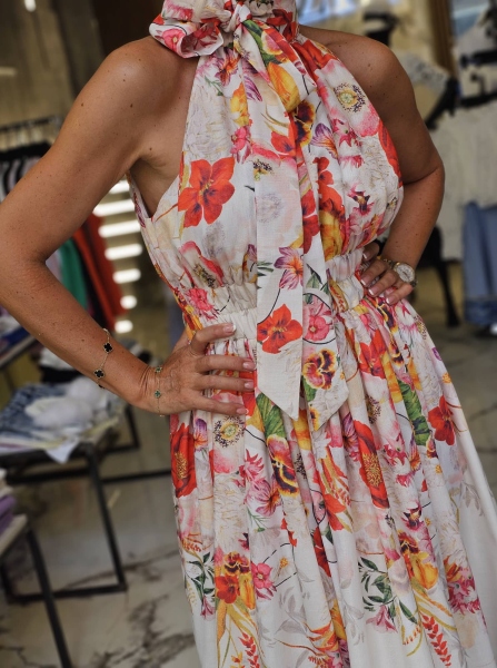 Пъстра рокля без ръкави с разкроена долна част. Моделът е с ластик на талията и се закопчава с цип.