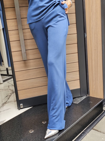 Ежедневен комплект от трико в тъмно син цвят. Блузата е със свободна кройка, реглан ръкав със 7/8 ръкав и декорация от камъчета и цвете брошка. Панталонът е с широки крачоли, ластик на талията и се закопчава с цип и копче.