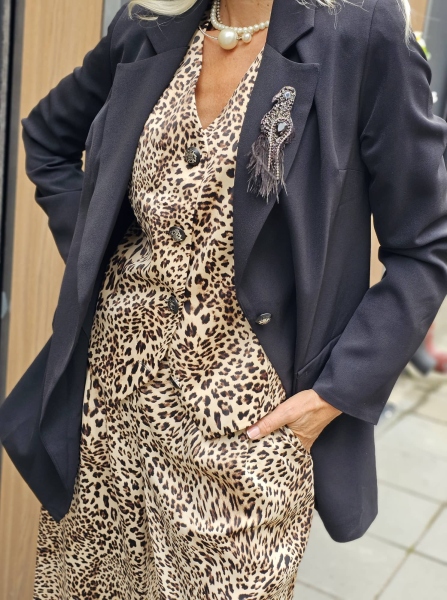 Комплект три части сако, елек и панталон. Сакото е с права кройка, закопчава се с копче и има към него брошка. Елекът е от сатенирана материя с втален силует и закопчаване с копчета. Панталонът е от сатенирана материя с широки крачоли и закопчаване с цип и копче.