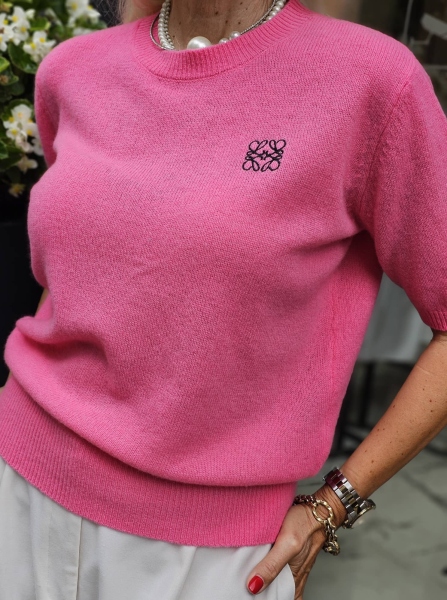 Блуза от фино плетиво в розов цвят с къс ръкав. Моделът е с втален силует. Размерът е универсален.
