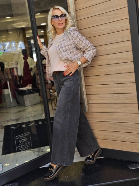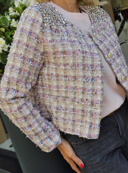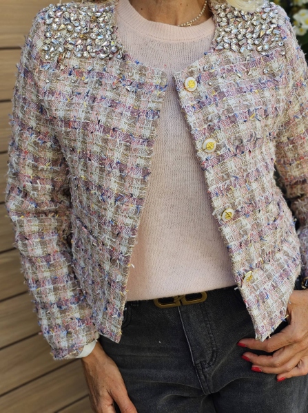 Сако от букле в розово- лилав меланж. Моделът е къс с прав силует. Размерът е универсален подходящ за S, M.