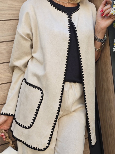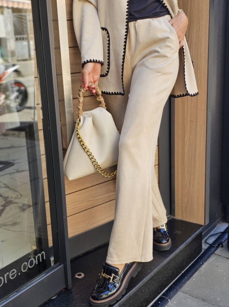 Комплект три части в бежов цвят от наподобяваща велур материя. Горната част е жакет със свободен силует без закопчаване. Блузата е без ръкав със свободен силует. Панталонът е с ластик на талията и свободни крачоли.