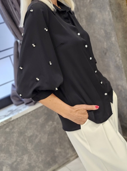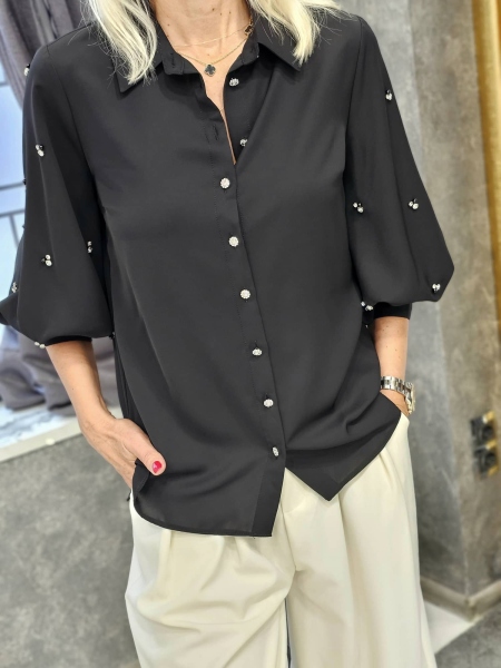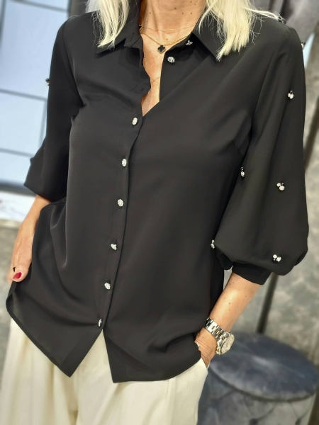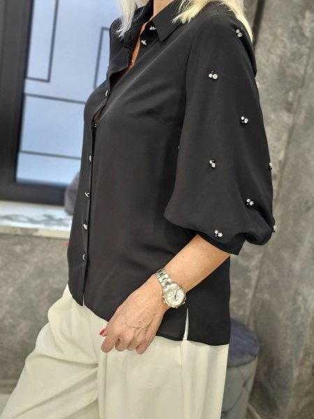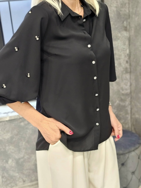 Риза от ефирна материя в черен цвят с 3/4 ръкав. Моделът се закопчава с копета.