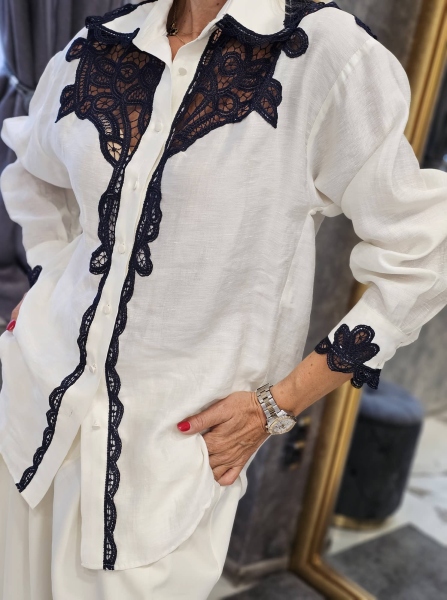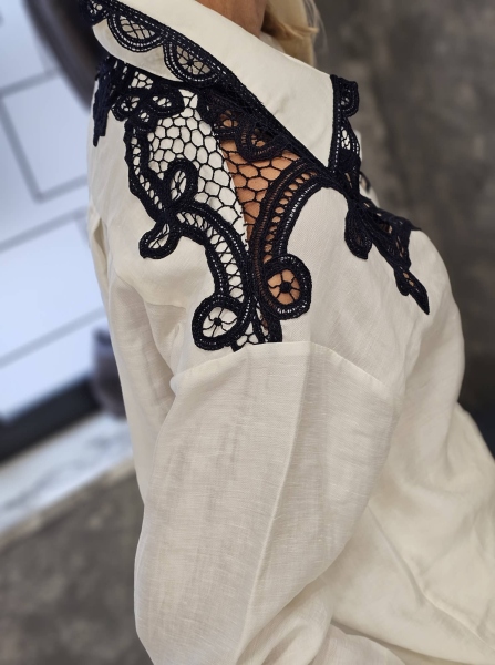Риза от ленена материя в цвят екрю с декорация от синя дантела. Моделът е свободен и се закопчава с копчета.