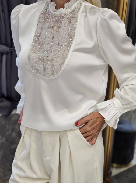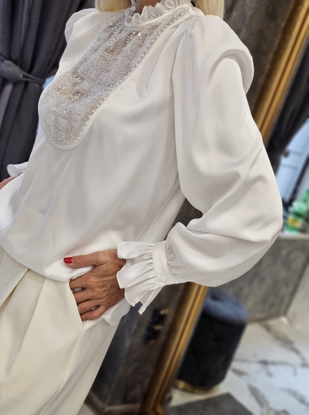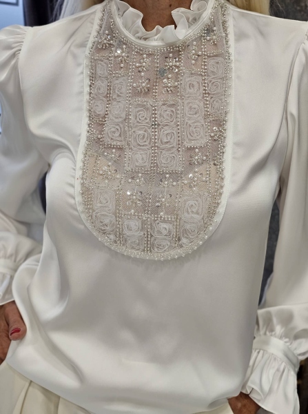 Риза от фина сатенирана материя в бял цвят с декорация от жабо с камъчета. Моделът е със свободен силует без закопчаване.