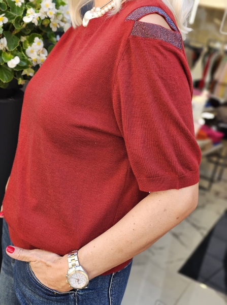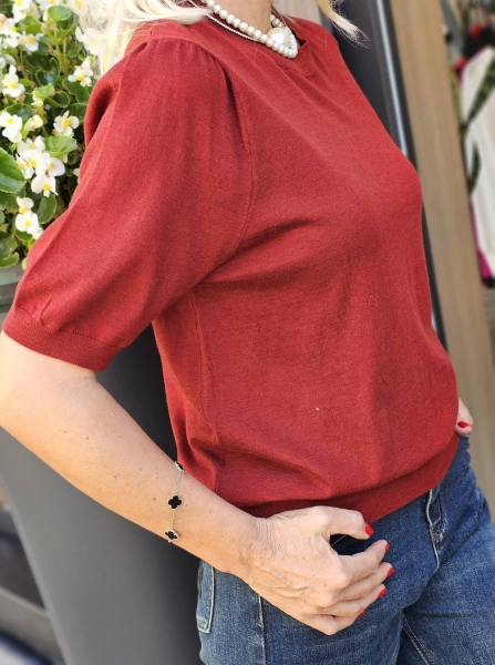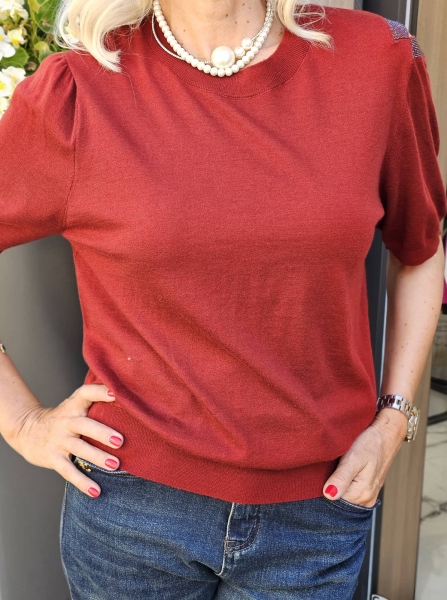Блуза от фино плетиво в цвят бордо с къс ръкав. Моделът е със свободен силует. Размерът е универсален.