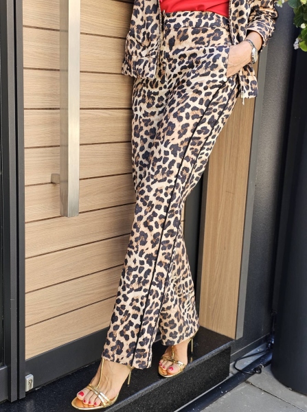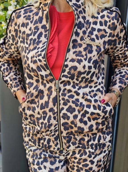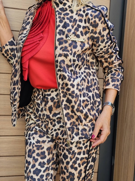 Комплект яке и панталон с животински десен. Якето се закопчава с метален цип, има ластици на ръкавите и в долнтата част на талията. Панталонът е с прав крачол, има странични джобове и се закопчава с цип и копче.