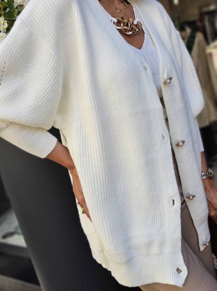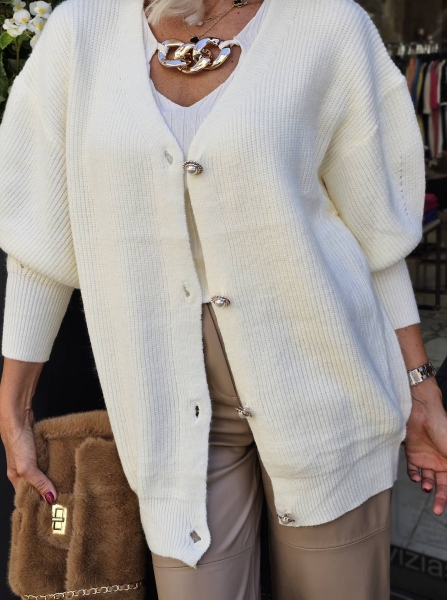 Жилетка от плетиво със свободен силует. Моделът се закопчава с копчета. Размерът е универсален и е подходящ за S, M, L.