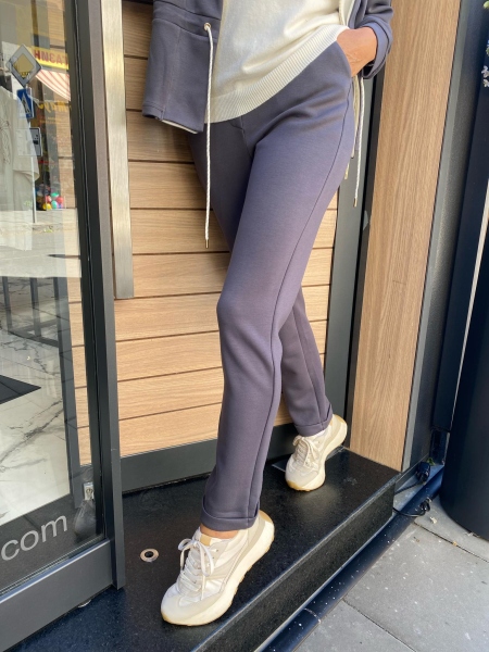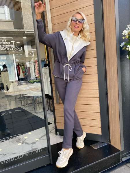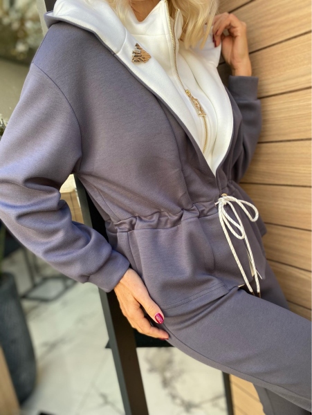 Комплект от трико в сив цвят. Якето е с двоен ревер, закопчаване с метален цип и връзки на талията за вталяване. Панталонът е с прави крачоли, ластик на талията и закопчаване с цип и копче.
