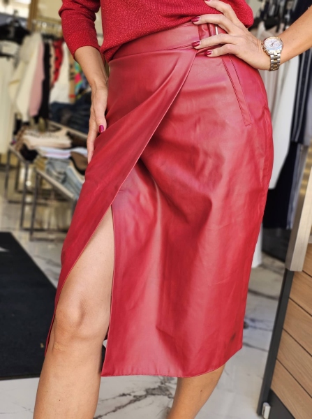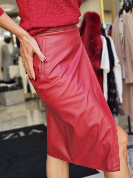 Пола от еко кожа тип молив с прехвърляне. Моделът се закопчава с цип.