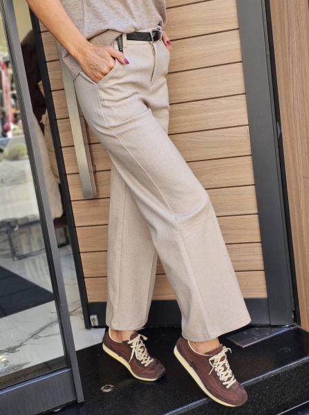Панталон в бежов цвят от плутна материя. Моделът е с прав крачол, закопчаване с цип и аксесоар колан.