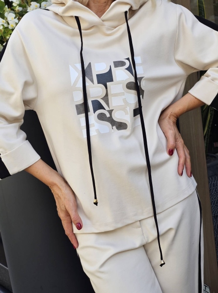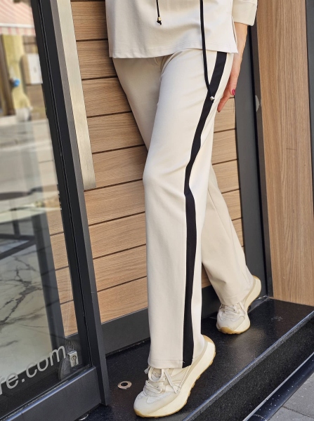 Ежедневен комплект от трико в цвят екрю с черен кант. Суитчер със свободен силует. Панталон с прави и свободни крачоли, ластик на талията и закопчаване с цип и копче.
