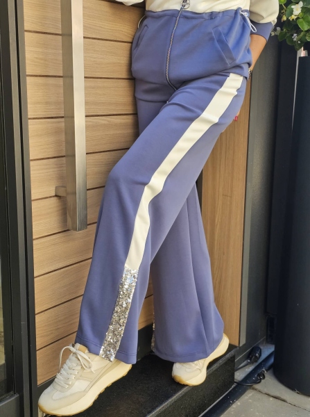 Комплект от две части в синьо и бяло с декорация от пайети. Горната част е тип суитчер, закопчаване с метален цип и ластици в талията за вталяване. Панталон с ластик на талията и широки крачоли.