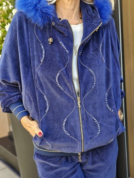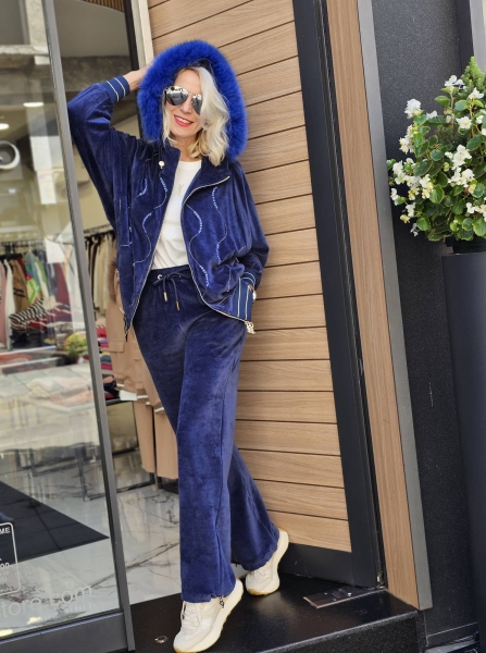 Ежедневен комплект три части от плюшена материя в син цвят. Суичтер с реглан ръкав, закопчаване с метален цип и качулка със сваляща се яка. Блуза с къс ръкав от памучна материя. Панталон с прави и свободни крачоли, ластик на талията, ластични връзки за прибиране на крачолите.