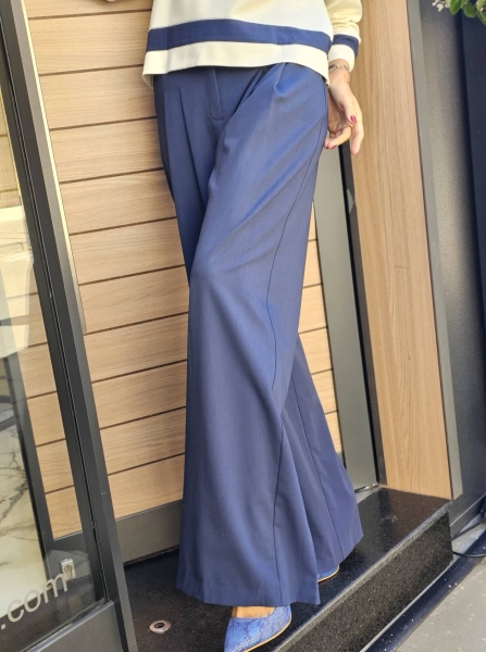 Комплект блуза и панталон в екрю и синьо. Блузата е от памучна материя, свободна кройка, асесоар брошка цвете. Панталон с басти и много широки крачоли, ластик на талията и закопчаване с цип и копче.