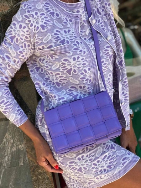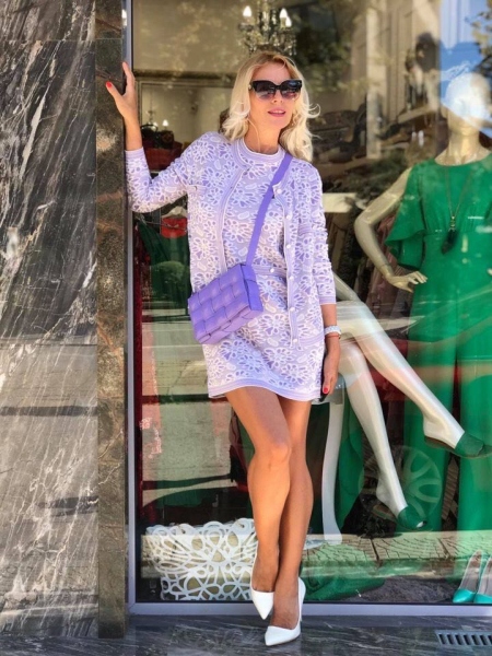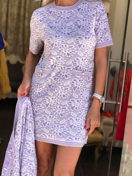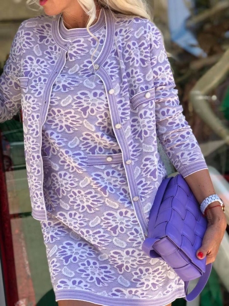 Комплект от рокля и жилетка в лилаво.Жилетката е с дълъг ръкав и се закопчава с копчета.Роклята е свободен модел с къс ръкав и дължина до коляното.Размера е универсален.