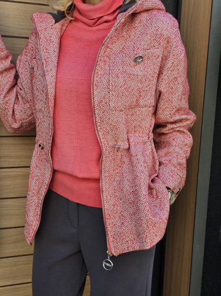 Комплект яке в червено и бяло и панталон в сиво. Якето е от плътна и топла материя с метален цип и ластици на талията за вталяване. Панталон от трико с ластик на талията и широки крачоли.