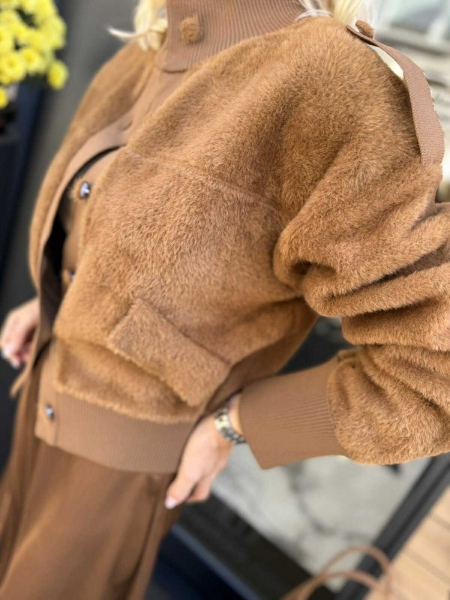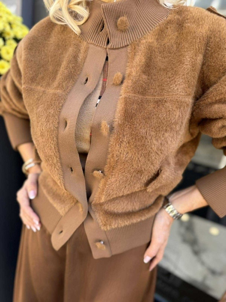 Къса жилетка от фино плетиво в цвят табак. Моделът се  закопчава с копчета.