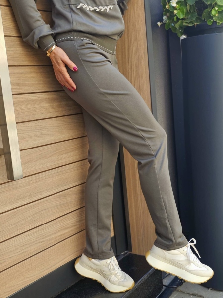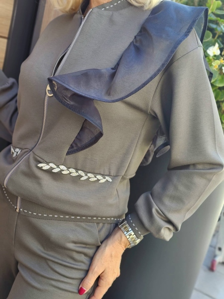 Комплект яке и панталон от трико в тъмно зелен цвят. Якето е с метален цип, ластик на яката и талията. Панталонът е със стесняващи се крачоли, ластик на талията и закопчаване с цип и копче.