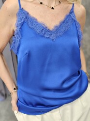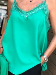 Топ с тънки презрамки и свободен силует от сатенирана материя.