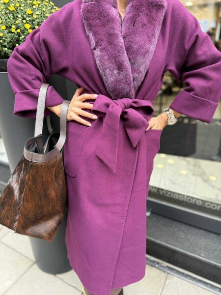 Палто в патладжанен цвят от гладка материя с яка от естествен косъм. Моделът е със свободен силует без закопчаване с прехвърляне и  текстилен колан за талията.