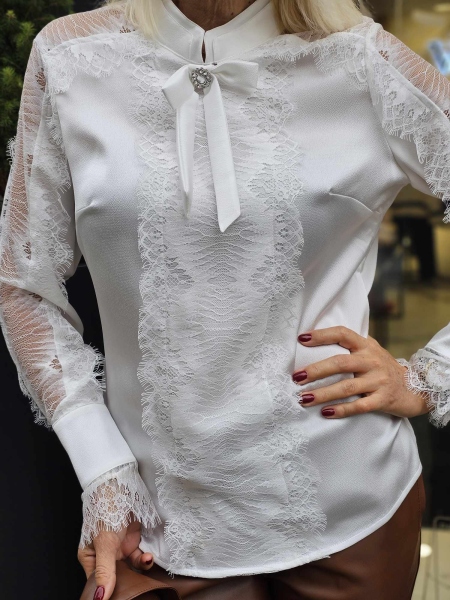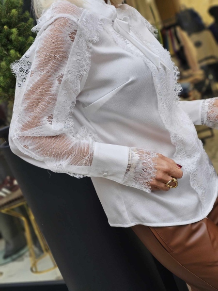Риза от фина сатенирана материя в бял цвят с декорация от дантела.