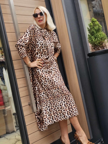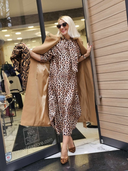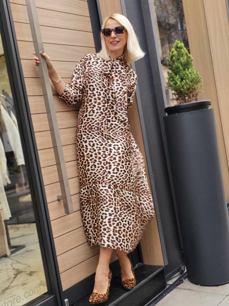 Рокля от фина сатенирана материя с животински десен с панделка фишу. Моделът е със свободна кройка.