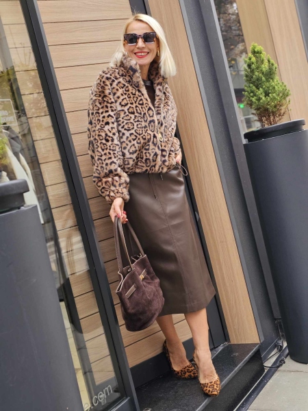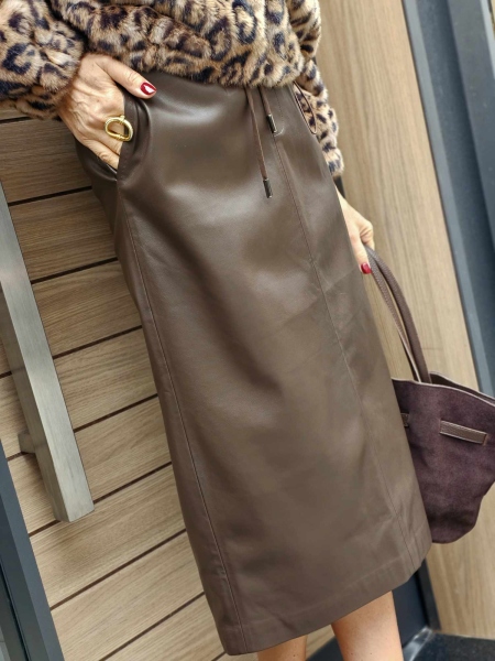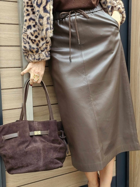 Пола от еко кожа в тъмно кафяв цвят. Моделът е с ластик на талията.