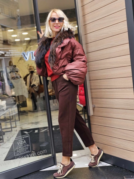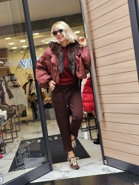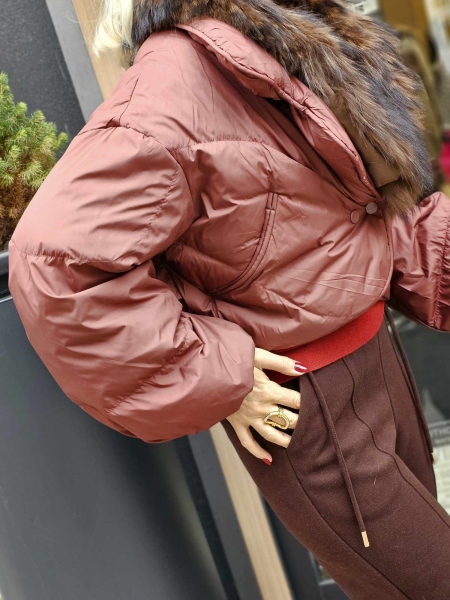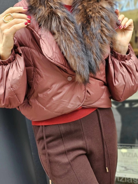 Късо яке от шушлякова материя с пълнеж от гъши пух. Яка от естествен косъм с възможност за сваляне. Закопчаване с копчета. Универсален размер подходящ за S/M.